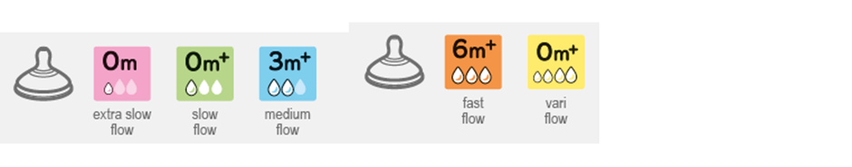 We have medium flow teats, which most babies are ready for at around 3 months, and a fast flow teat which is best from around 6 months. The ages are only guides though - you know your baby better than anyone and will be able to tell when they’re ready for a faster flow.